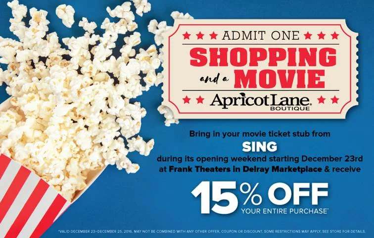 Bring your movie ticket stub from SING during it's opening weekend at Frank Theatres to Apricot Lane at Delray Marketplace December 23 - December 24 to receive 15% off your entire purchase!