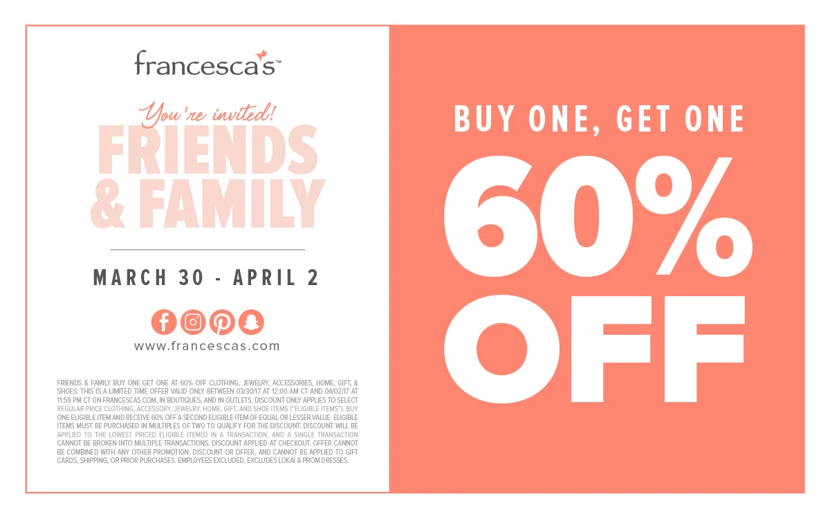 You’re invited to francesca's Friends & Family Event — March 30 - April 2, 2017! See the coupon below or ask an associate for details.