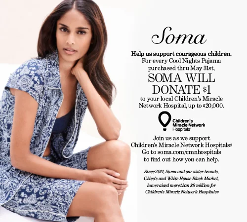 Shop Soma Intimates and help Children's Miracle Network. For every Cool Nights Pajama purchased thru May 31st, Soma will donate $1 to your local Children’s Miracle Network Hospital, up to $20,000.