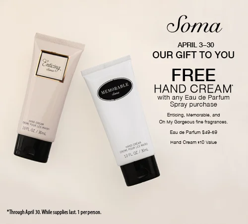 Soma Intimates - Free Hand Cream Monday, April 3, 2017 10:00 AM 10:00 Sunday, April 30, 2017 9:00 PM 21:00 Google Calendar ICS Free Hand Cream with any Eau de Parfum purchase at Soma Intimates through April 30. While supplies last. 1 per person.